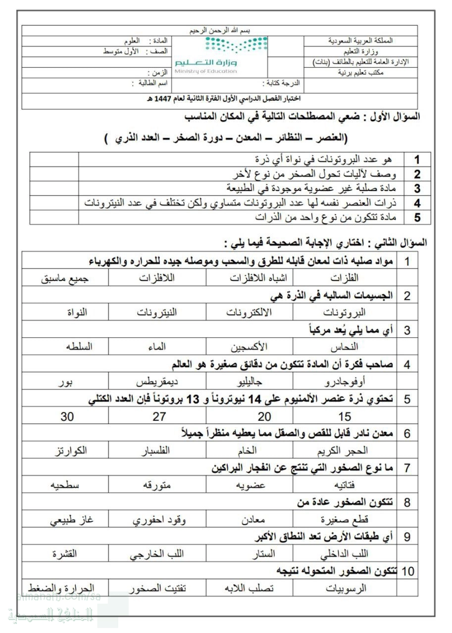 | اختبار الفترة الثانية حول التركيب الذري والمادة وعلم الأرض | ||