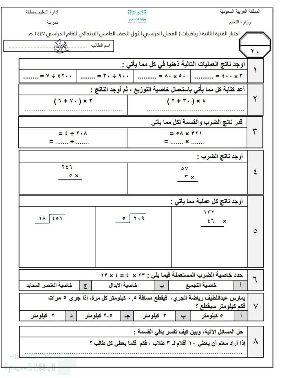 معلومات الملف: يغطي هذا الاختبار الفترة الثانية في مادة الرياضيات للصف الخامس الابتدائي، ويركز على مجموعة من المهارات الحسابية والمفاهيم الأساسية. الهدف الرئيسي هو تقييم مدى إتقان الطالب للعمليات الحسابية الأربع (الجمع، الطرح، الضرب، القسمة) في نطاق الأعداد الكبيرة نسبياً. كما يختبر فهم الطالب لخصائص الضرب الأساسية (الإبدال، التجميع، التوزيع، والعنصر المحايد). يضع الاختبار هذه المهارات في سياق حل مسائل حياتية، مثل حساب المسافة المقطوعة في الرياضة، وتوزيع الأقلام على الطلاب. | ||