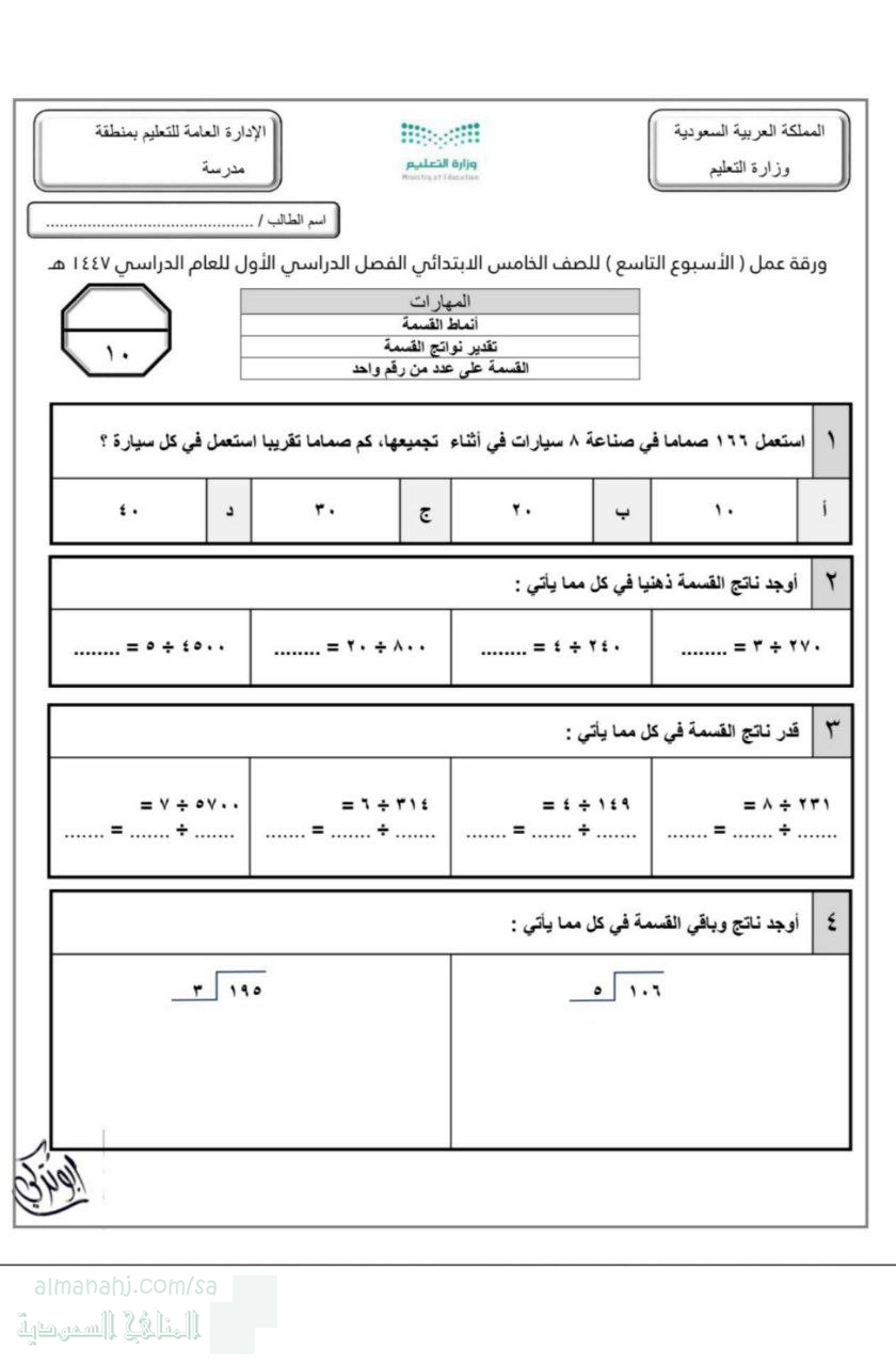 معلومات الملف: يركز هذا الملف (المكون من عدة أوراق) على مهارة القسمة وخاصية تفسير باقي القسمة للصف الخامس الابتدائي. يهدف إلى تطوير كفاءة الطالب في القسمة على عدد من رقم واحد ورقمين، مع تقديرات ذهنية أولية. المحور الأهم هو ربط المهارة الحسابية بالحياة الواقعية من خلال مسائل تطبيقية متنوعة، مثل: حساب ثمن الوجبة الواحدة عند معرفة المجموع وعدد الأفراد، ومعرفة عدد الأغراض التي يمكن شراؤها بمبلغ معين (كالربطات)، وحساب عدد الوحدات التي تناسب مساحة معينة (كاللوحات على جدار). التركيز الخاص على "تفسير باقي القسمة" ينمي التفكير المنطقي لدى الطالب، حيث لا يكفي إيجاد الناتج فقط، بل فهم معنى الباقي في السياق، كما في مسائل توزيع الأقلام أو البيض أو القصص القصيرة بين أفراد. | ||
