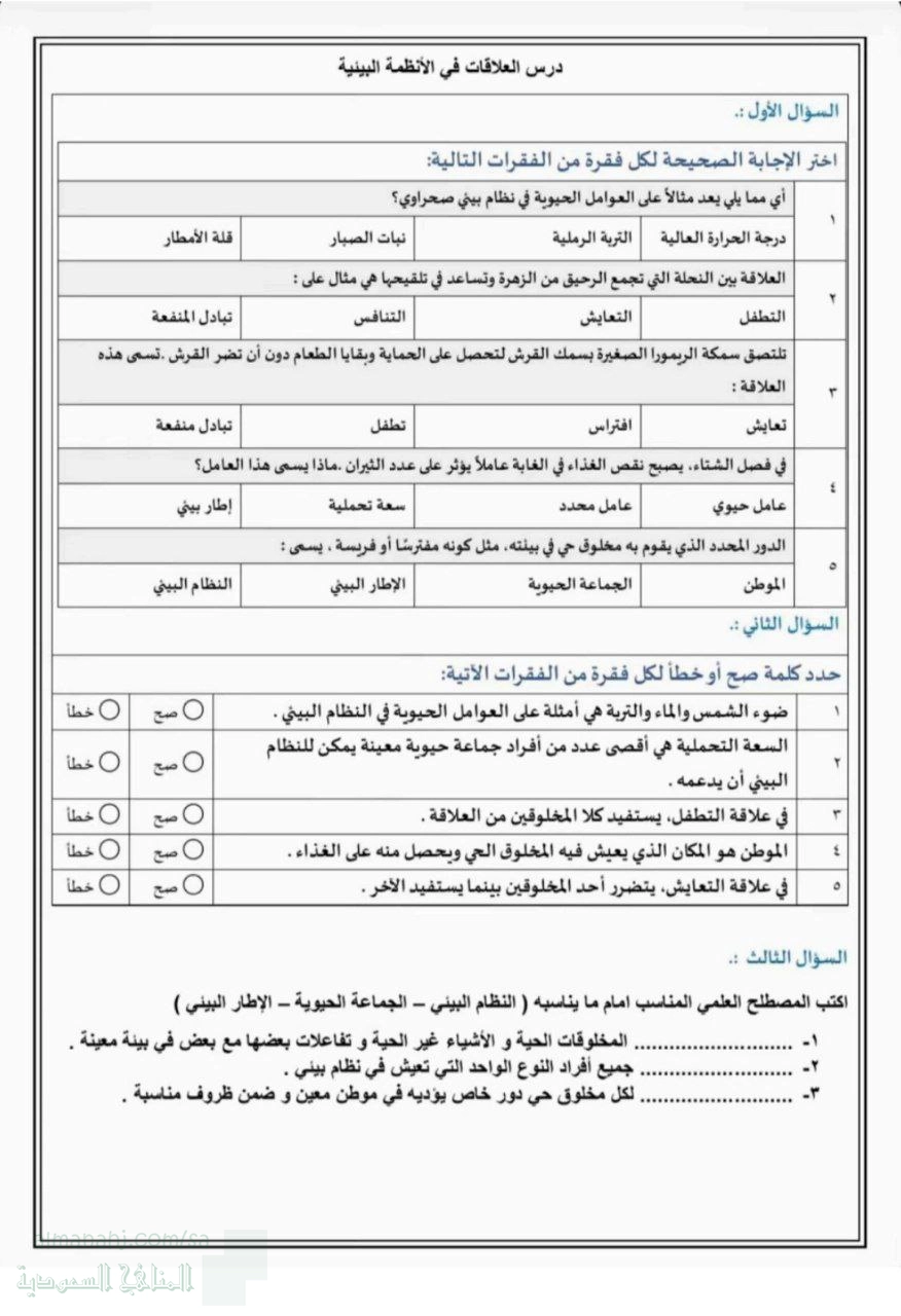 تم إيجاد الملف: أوراق العمل الشاملة لوحدة الأنظمة البيئية والعلاقات البيئية