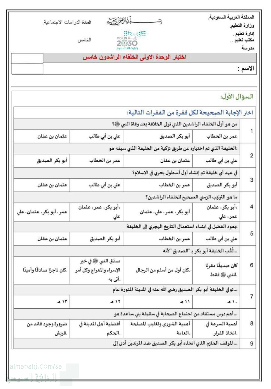 معلومات الملف: يغطي هذا الملف المكثف اختبارات متعددة لمادة الدراسات الاجتماعية (اجتماعيات) للصف الخامس، ويركز على ثلاثة أبعاد رئيسية. أولاً، التاريخ الإسلامي، من خلال استعراض عصر الخلفاء الراشدين (أعمالهم، صفاتهم، التحديات مثل حروب الردة والفتنة)، ثم الانتقال إلى الدولتين الأموية والعباسية (قيامهما، إنجازاتهما، مدنهما)، وانتهاءً بمساهمات الحضارة الإسلامية في العلوم والإدارة. ثانياً، الأمن الوطني والمواطنة، حيث يُعرِّف بأجهزة الأمن المختلفة (الدفاع، الدفاع المدني، حرس الحدود) واختصاصاتها، ويؤكد على دور المواطن في الحفاظ على الأمن عبر الوعي السلوكي، والتبليغ عن المخالفات، ومكافحة الشائعات. ثالثاً، الجغرافيا الوطنية، بتحليل موقع المملكة العربية السعودية وحدودها وأهميتها الدينية، والتركيز على تضاريسها المتنوعة (الصحاري كالربع الخالي، الهضاب كنجد، الجبال كالحجاز، الأودية، الجزر)، وربط هذه المكونات بالثروات الطبيعية (النفط) والمشاريع التنموية (رؤية 2030). تهدف هذه الاختبارات إلى بناء وعي تاريخي وتراثي، وغرس قيم الانتماء والمسؤولية الوطنية، وتنمية المعرفة الجغرافية لدى الطالب. | ||