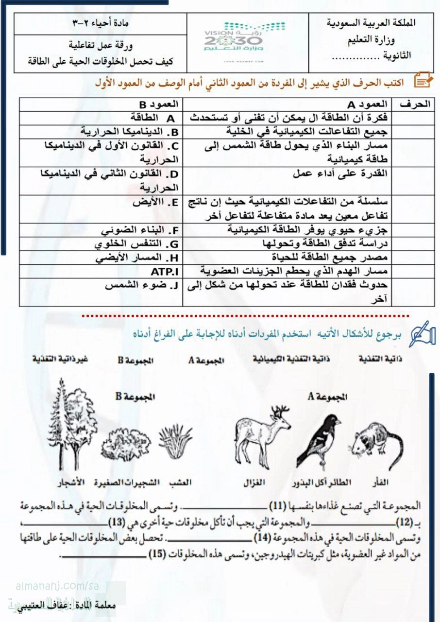 2. علوم, الفصل الأول, 1447_1448, ورقة عمل تفاعلية حول انتقال الطاقة والتمثيل الغذائي