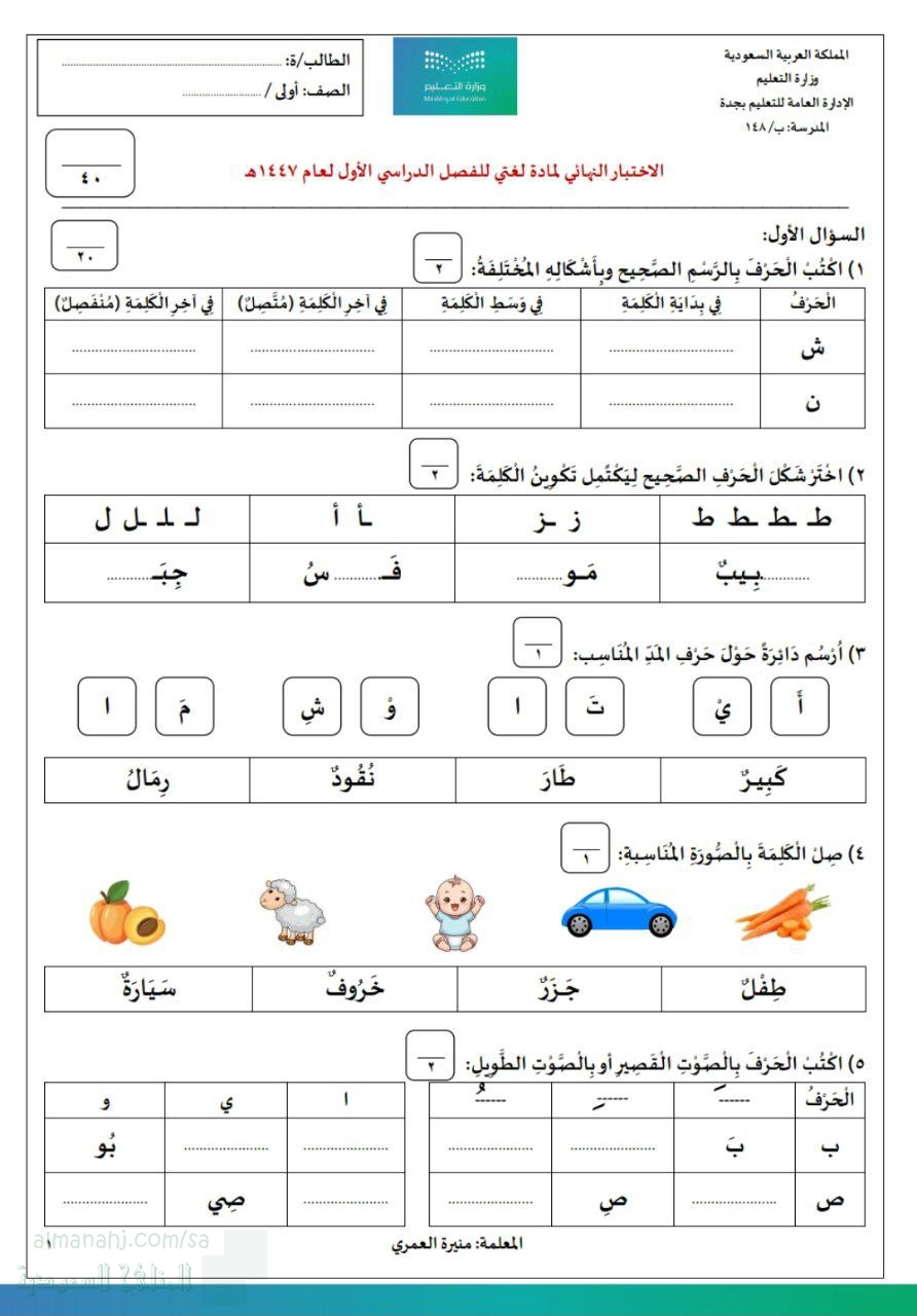 معلومات الملف: يحتوي الاختبار النهائي لمادة لغتي للصف الأول الابتدائي على مجموعة متنوعة من الأسئلة المصممة لتقييم المهارات الأساسية في اللغة العربية. تشمل هذه المهارات كتابة الحروف بأشكالها المختلفة (في أول ووسط وآخر الكلمة)، وتمييز الأصوات القصيرة والطويلة، وتكوين الكلمات والجمل، والربط بين الصور والكلمات المناسبة. كما يتضمن أسئلة في الترتيب الصحيح للحروف، والإملاء، وتحليل الكلمات إلى مقاطع صوتية. يهدف الاختبار إلى قياس مدى تمكن الطالب من أساسيات القراءة والكتابة في نهاية الفصل الدراسي الأول، مع التركيز على الدقة والوضوح في الكتابة. | ||