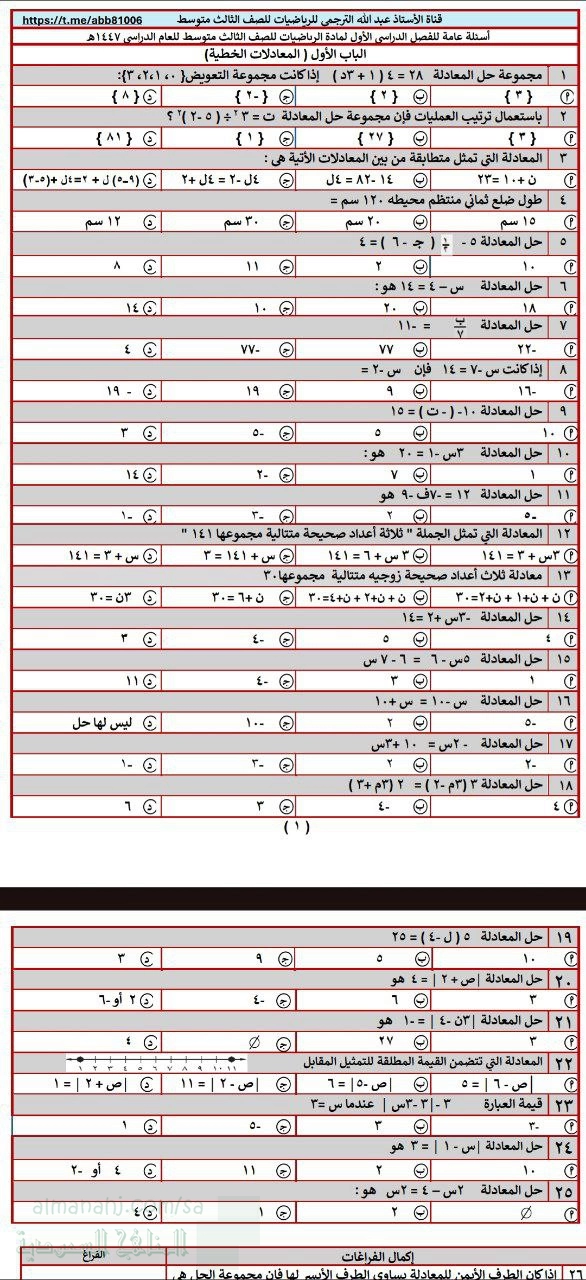 معلومات الملف: يحتوي ملف أسئلة الفصل الدراسي الأول لمادة الرياضيات على تدريبات شاملة تغطي أربعة محاور أساسية: المعادلات الخطية وتمارين على حلها وخصائصها، و الدوال الخطية ومفاهيم المجال والمدى والميل، و المتباينات الخطية بما فيها المتباينات بالقيمة المطلقة وتمثيلاتها البيانية، و أنظمة المعادلات الخطية وطرق حلها كالتعويض والحذف والتمثيل البياني. الأسئلة تتنوع بين اختيار من متعدد، وإكمال الفراغ، والمقالية. | ||