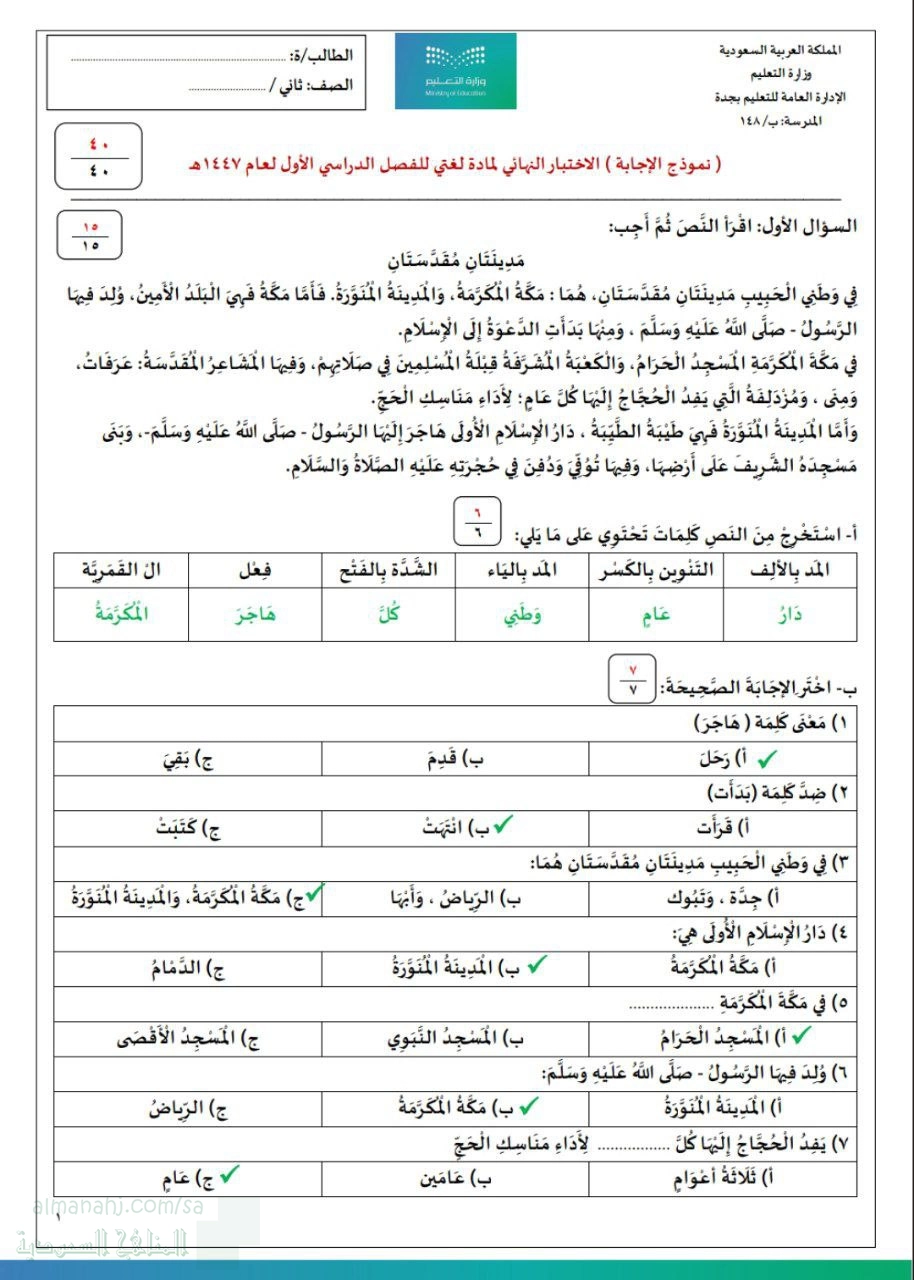 | إجابة الاختبار النهائي التابع للإدارة العامة بمنطقة جدة - إعداد: الإدارة العامة للتعليم بمنطقة جدة | ||