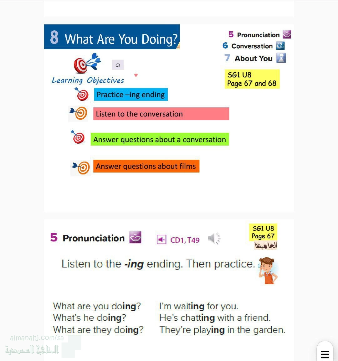 معلومات الملف: مراجعة الدرس الرابع Pronunciation and conversation من الوحدة الثامنة What are you doing ? | ||