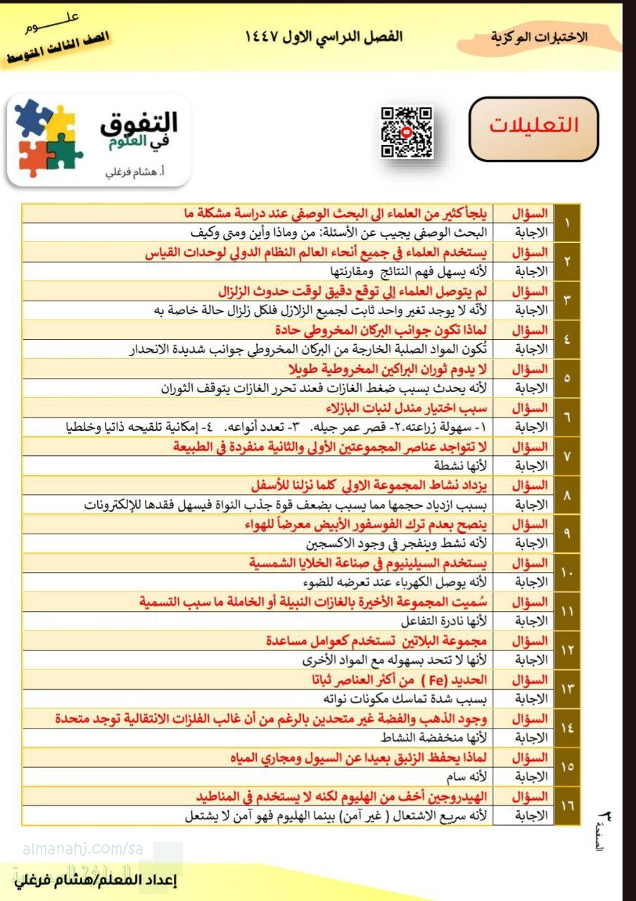 التعليلات العلمية المهمة, الصف الثالث المتوسط, علوم, الفصل الأول, 1447_1448 - المناهج السعودية