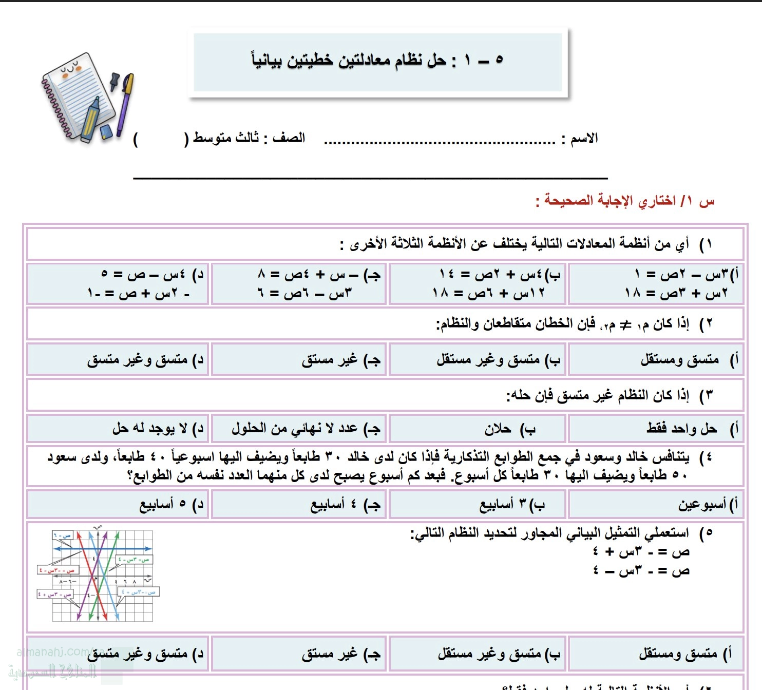 يحتوي الملف على أوراق عمل رياضيات للصف الثالث المتوسط تتناول حل أنظمة المعادلات الخطية بطرق مختلفة: 1.