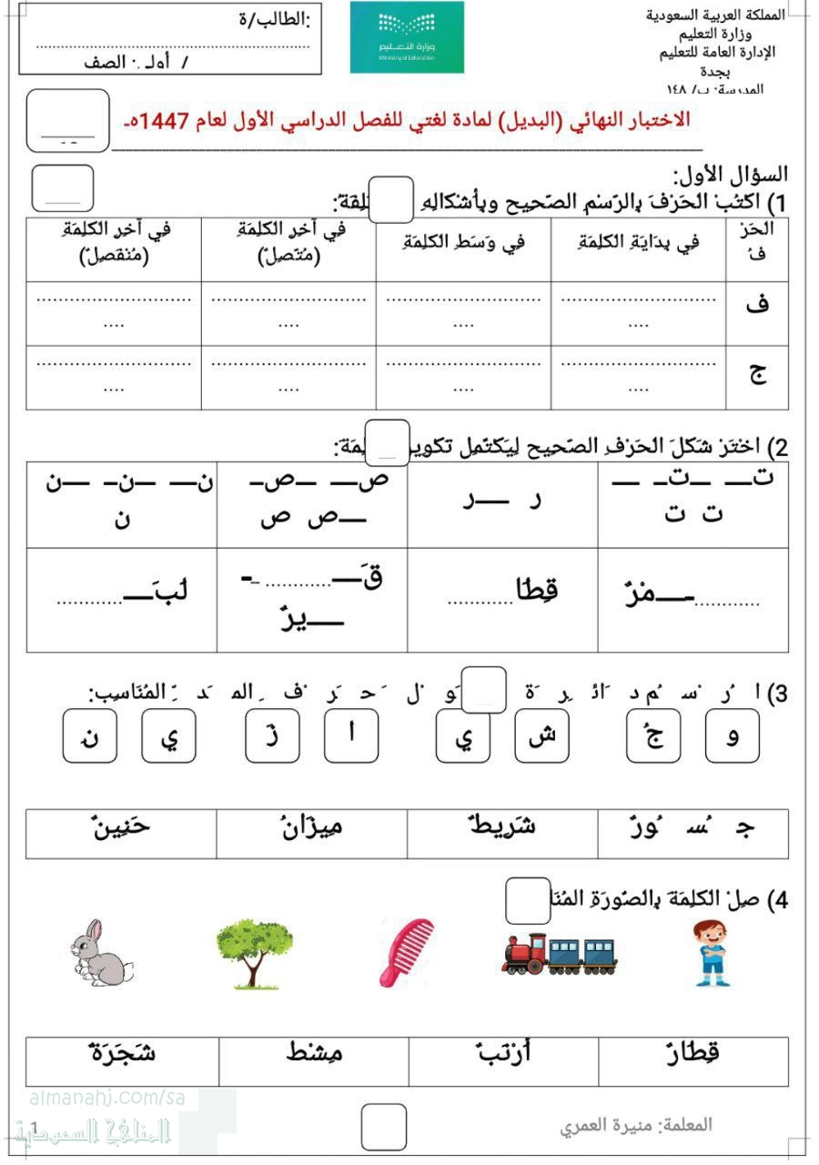 11. الصف الأول, لغة عربية, الاختبار النهائي البديل لغتي