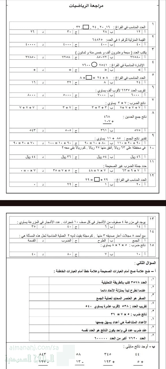 9. الصف الثالث, رياضيات, مراجعة اختبار قراءة وكتابة الأعداد مرفق بالإجابة