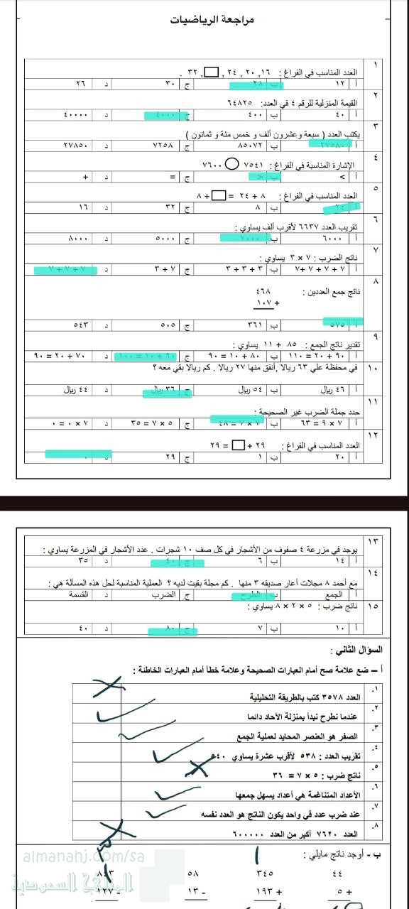 9. الصف الثالث, رياضيات, مراجعة اختبار قراءة وكتابة الأعداد مرفق بالإجابة