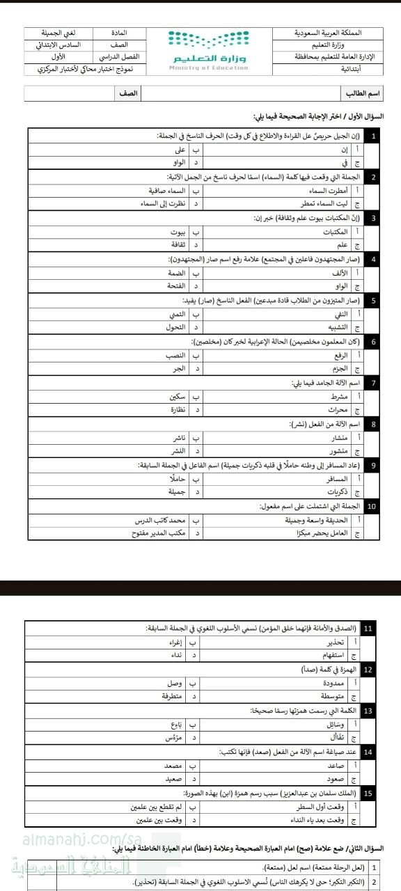 6. الصف السادس, لغة عربية, الاختبار التجريبي الثاني المحاكي للاختبار المركزي
