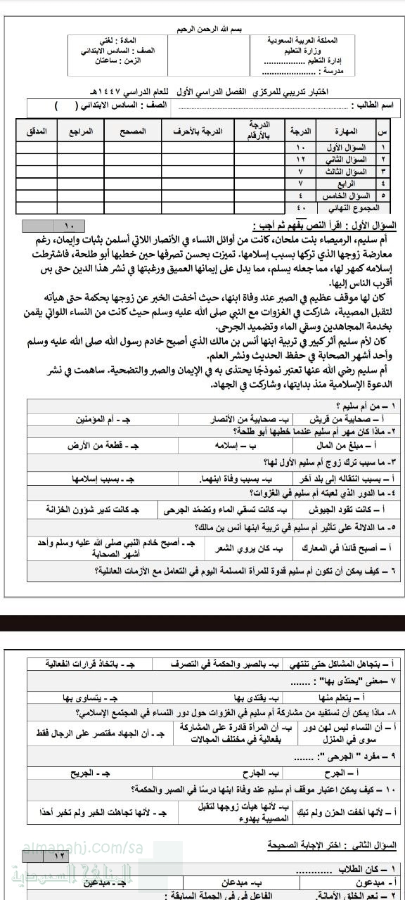 اختبار تدريبي مركزي حول المهارات النحوية والصرفية, الصف السادس, لغة عربية, الفصل الأول, 1447_1448 - المناهج السعودية