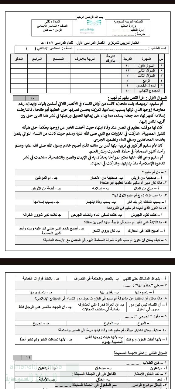 8. الصف السادس, لغة عربية, أسئلة الاختبار النهائي