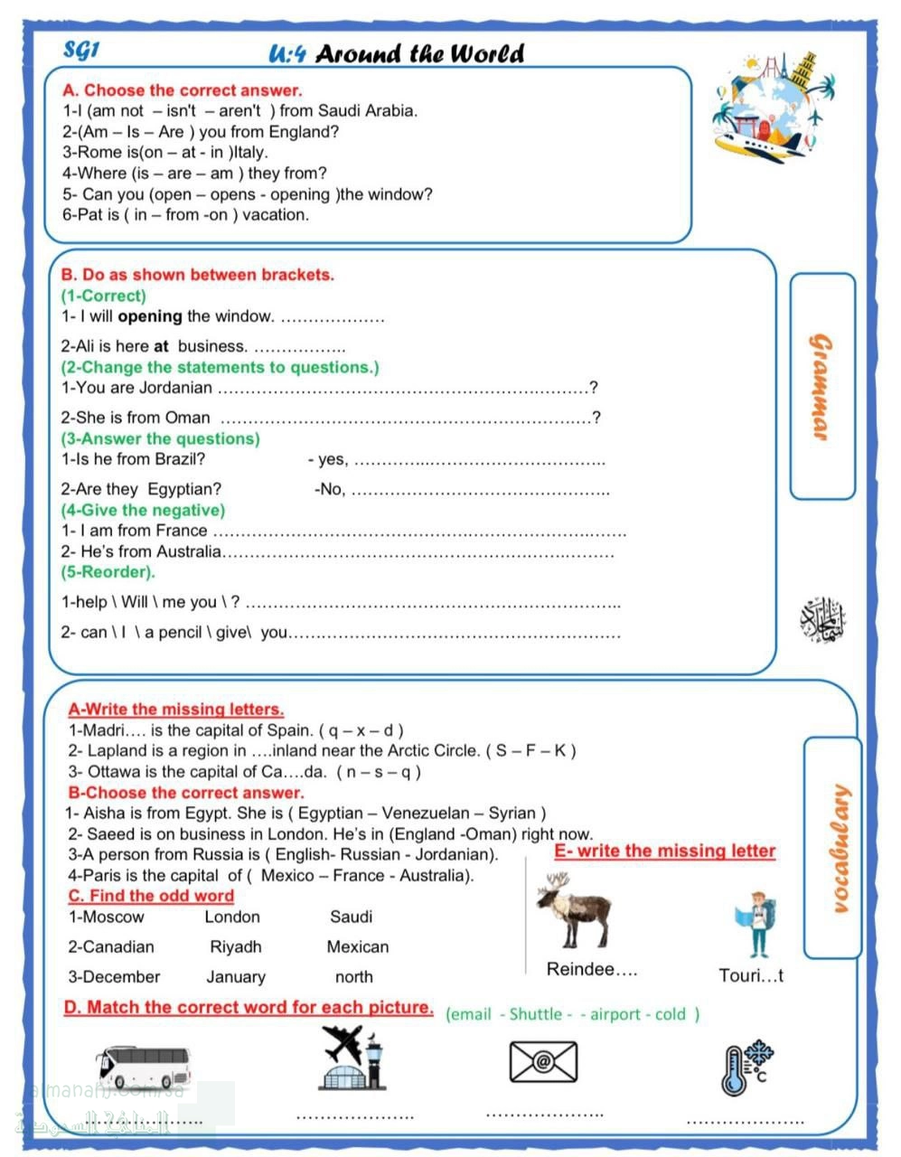 1. الصف الأول المتوسط, لغة انجليزية, اختبار مراجعة نهائية
