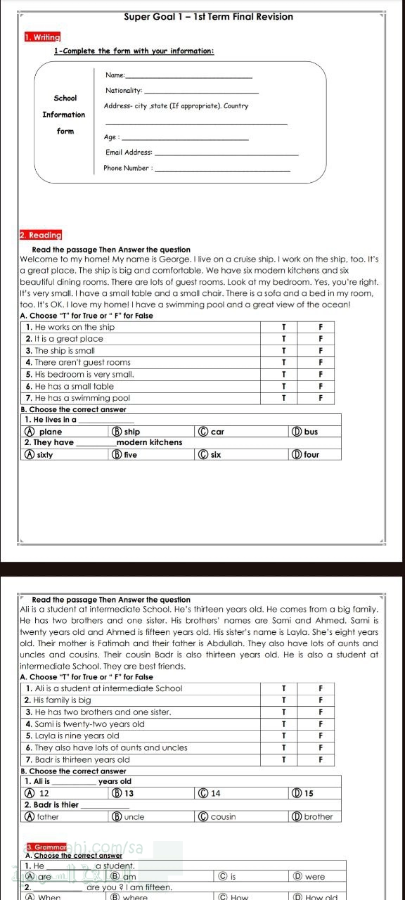 1. الصف الأول المتوسط, لغة انجليزية, اختبار مراجعة نهائية
