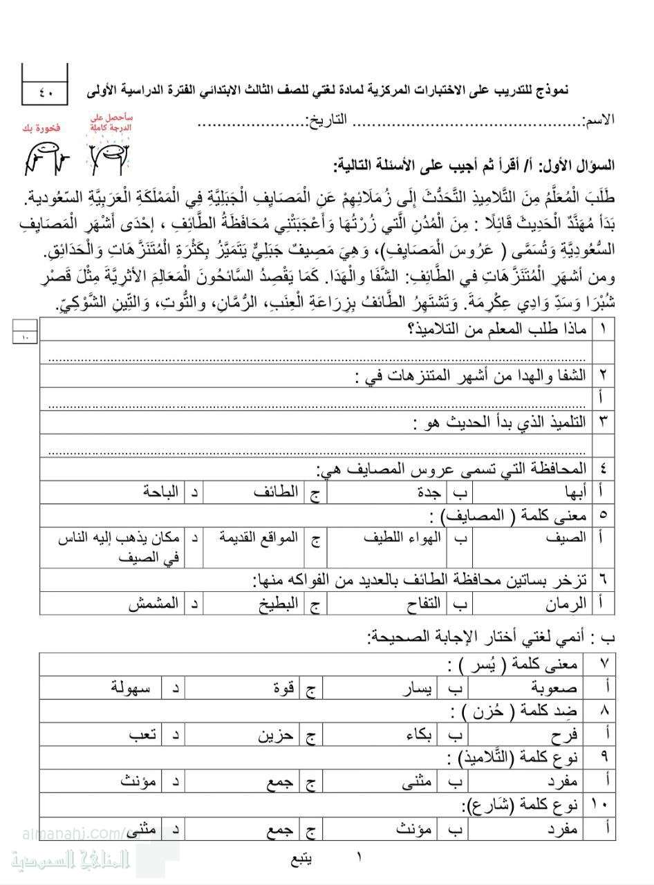 11. الصف الثالث, لغة عربية, نموذج مراجعة للاختبار المركزي لغتي
