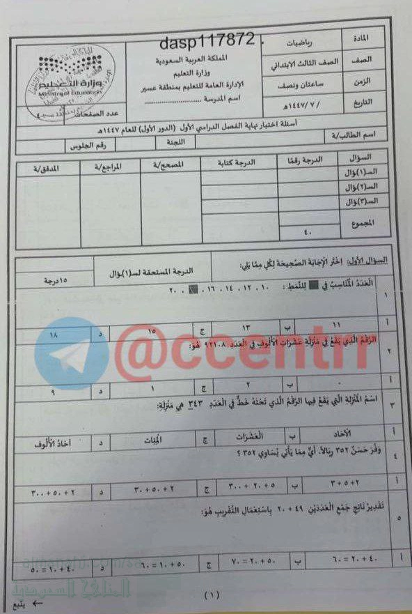 معلومات الملف: نقدم لكم في هذا الملف اختبار مركزي بمنطقة عسير في مادة الرياضيات للصف الثالث الابتدائي للفصل الدراسي الأول للعام 1447هـ... | ||
