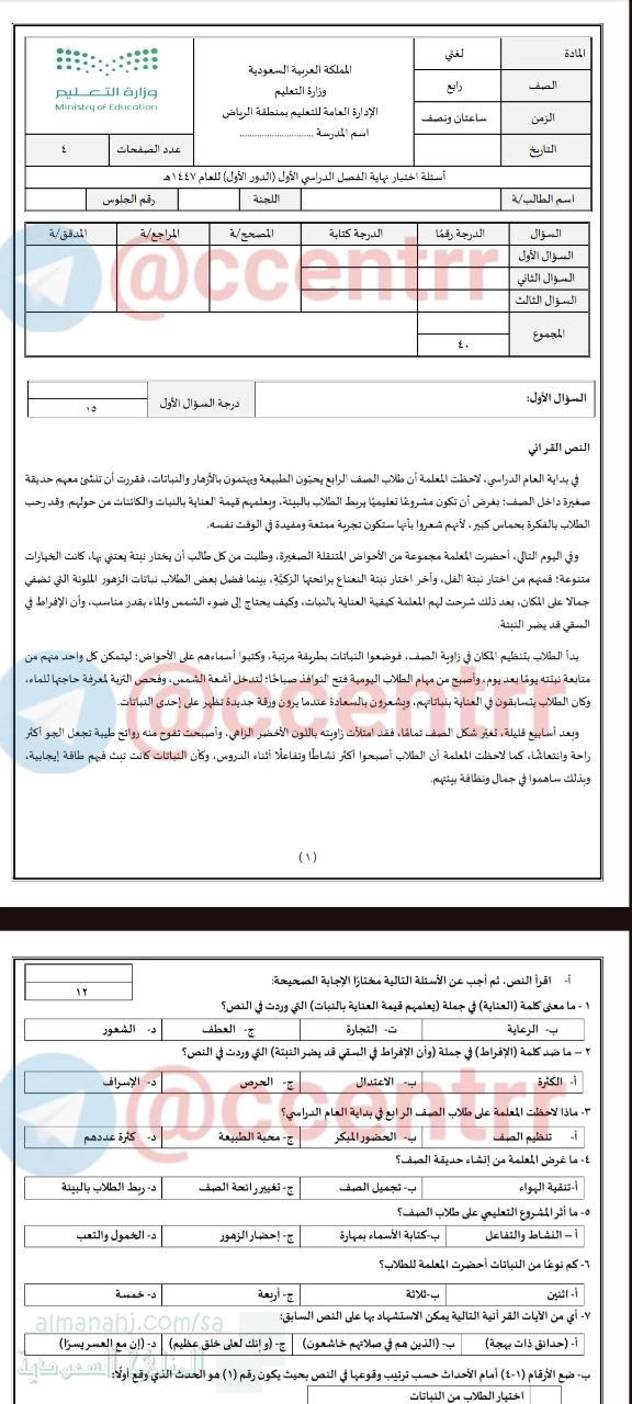 نقدم لكم في هذا الملف اختبار مركزي بمنطقة الرياض في مادة اللغة العربية للصف الرابع للفصل الدراسي الأول للعام 1447هـ...