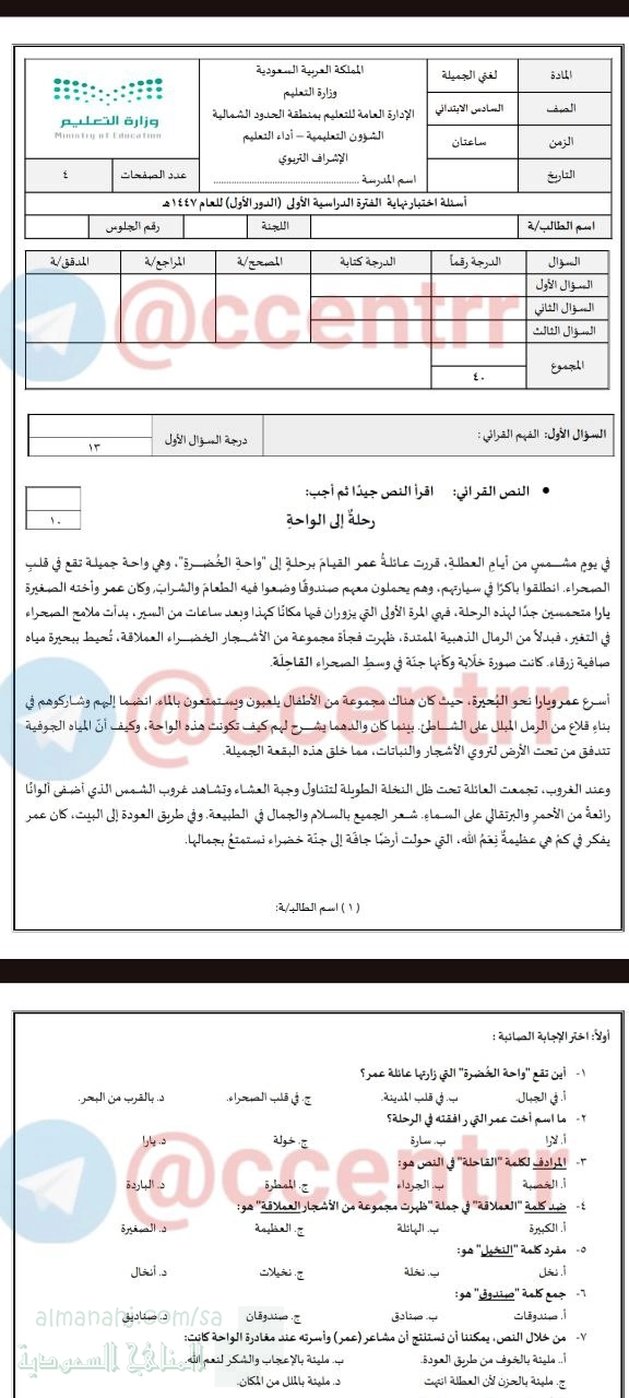 نقدم لكم في هذا الملف اختبار مركزي بمنطقة الحدود الشمالية في مادة اللغة العربية للصف السادس للفصل الدراسي الأول للعام 1447هـ...
