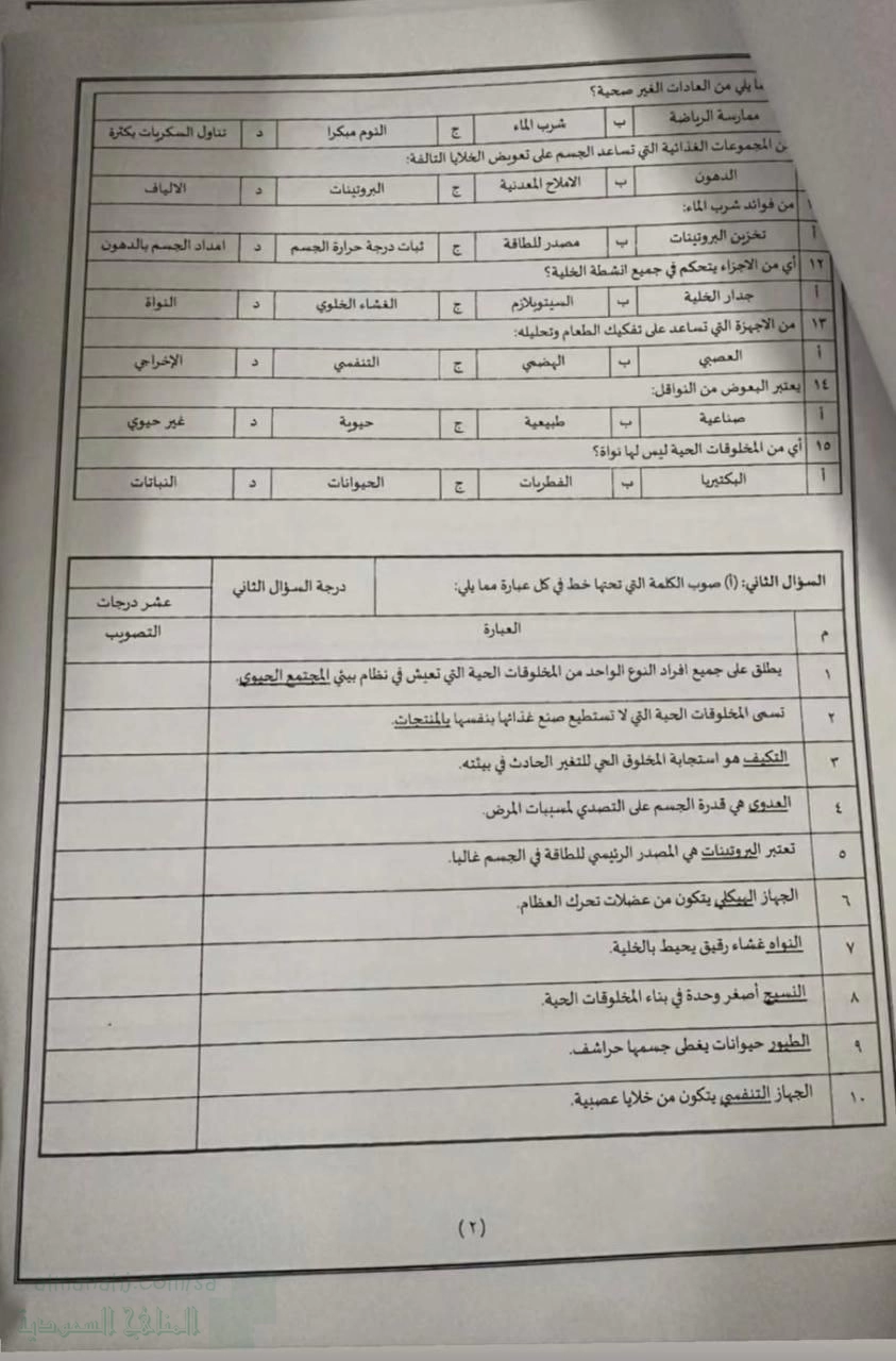 9. علوم, الفصل الأول, 1447_1448, إجابة اختبار مركزي تابع لمحافظة عسير