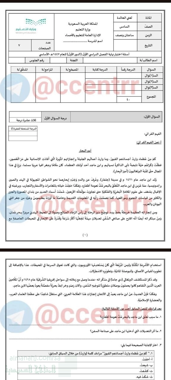 نقدم لكم في هذا الملف إجابة اختبار مركزي بمنطقة الأحساء في مادة اللغة العربية للصف السادس للفصل الدراسي الأول للعام 1447هـ...