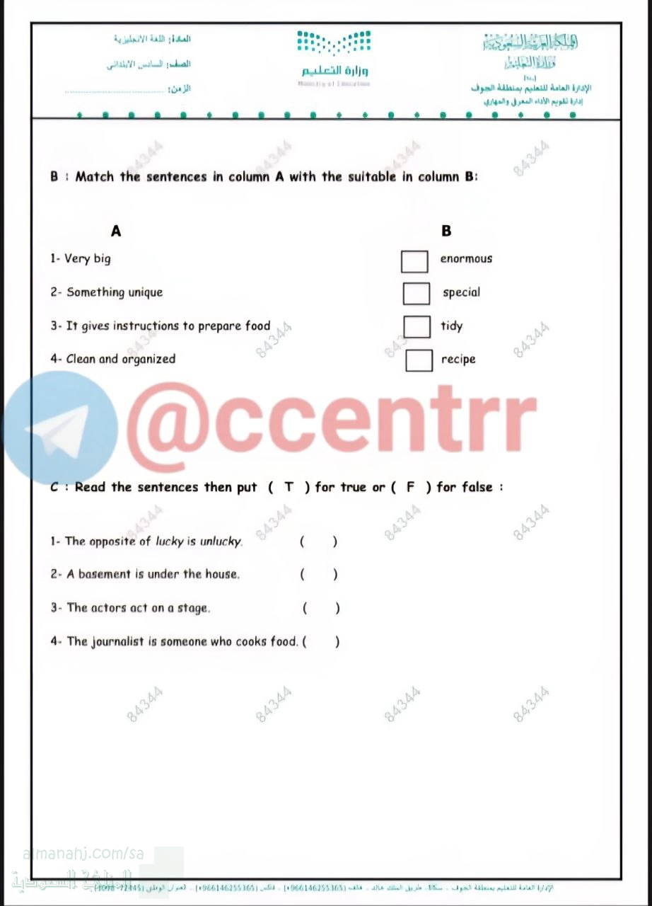 اختبار مركزي تابع لمحافظة الجوف, الإدارة العامة للتعليم بمنطقة الجوف, الصف السادس, لغة انجليزية, الفصل الأول, 1447_1448 - المناهج السعودية