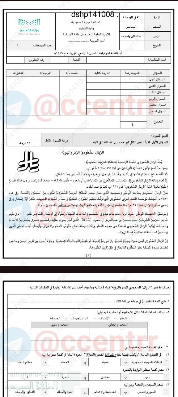 نقدم لكم في هذا الملف اختبار مركزي بمنطقة الشرقية في مادة اللغة العربية للصف السادس للفصل الدراسي الأول للعام 1447هـ...