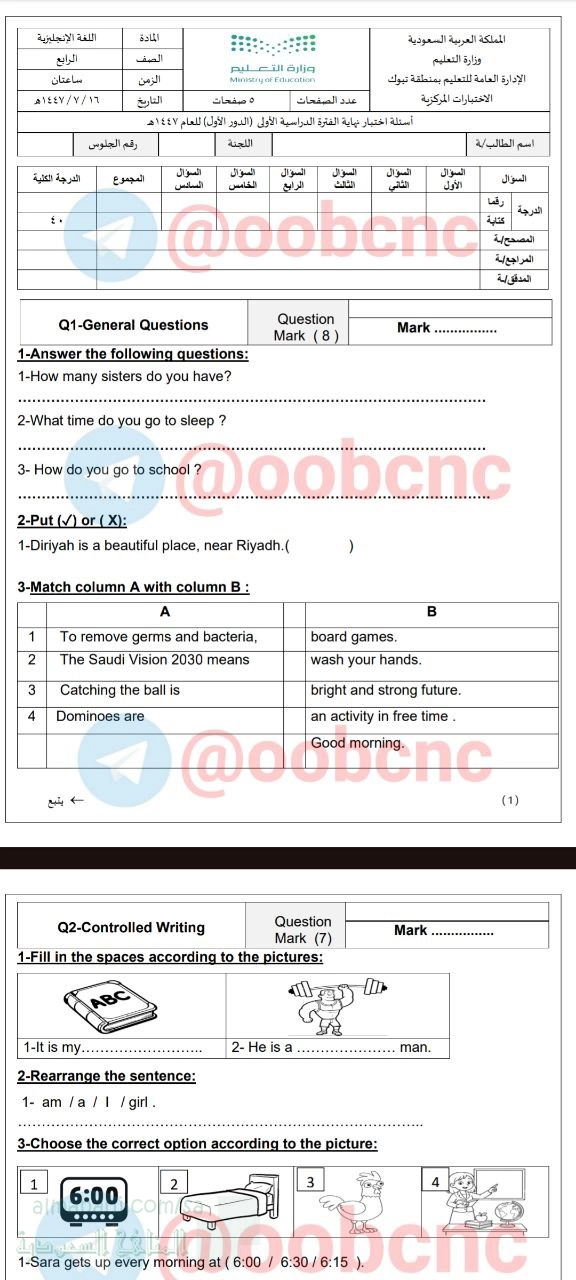 اختبار مركزي تابع لمنطقة تبوك, الإدارة العامة للتعليم بمنطقة تبوك, الصف الرابع, لغة انجليزية, الفصل الأول, 1447_1448 - المناهج السعودية