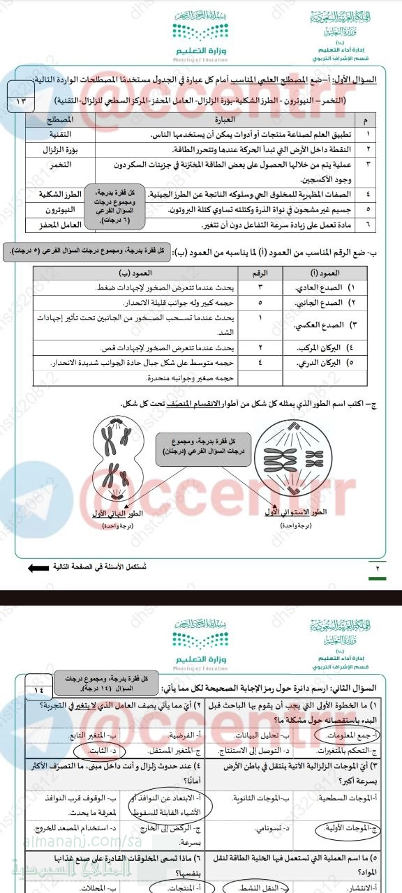 1. علوم, الفصل الأول, 1447_1448, اختبار مركزي تابع لمنطقة الشرقية