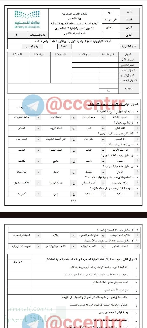15. الصف السادس, علوم, اختبار مركزي تابع لمنطقة جدة