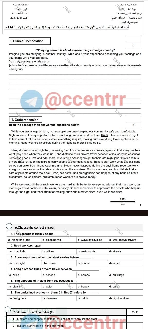 معلومات الملف: نقدم لكم في هذا الملف إجابة اختبار مركزي بمنطقة جدة في مادة اللغة الانجليزية للصف الثالث المتوسط للفصل الدراسي الأول للعام 1447هـ... | ||