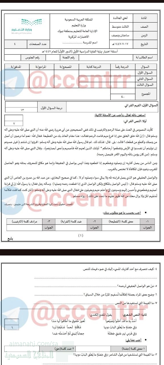 معلومات الملف: نقدم لكم في هذا الملف اختبار مركزي بمنطقة تبوك في مادة اللغة العربية للصف الثالث المتوسط للفصل الدراسي الأول للعام 1447هـ... | ||