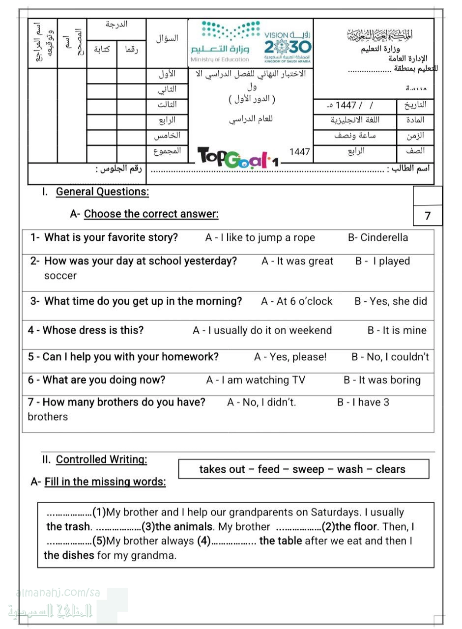معلومات الملف: يحتوي هذا الملف على اختبار نهائي لمادة اللغة الإنجليزية مُوجه لطلاب الصف الرابع الابتدائي للعام الدراسي 1447هـ (الدور الأول). | ||