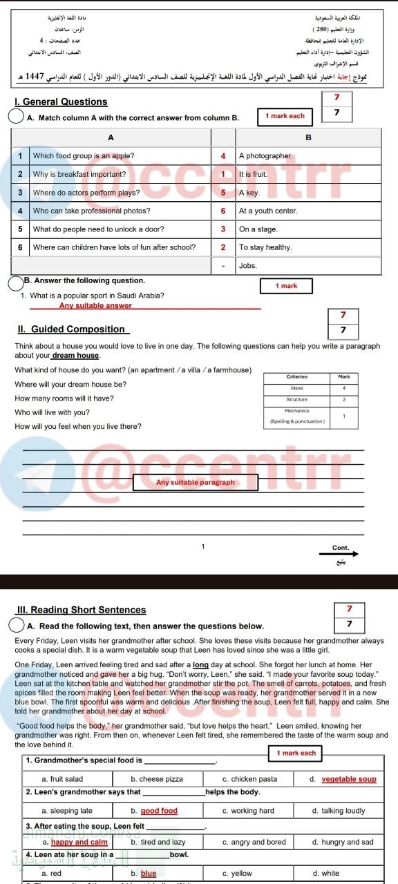 معلومات الملف: نقدم لكم في هذا الملف إجابة اختبار مركزي بمنطقة جدة في مادة اللغة الإنجليزية للصف السادس للفصل الدراسي الأول للعام 1447هـ... | ||
