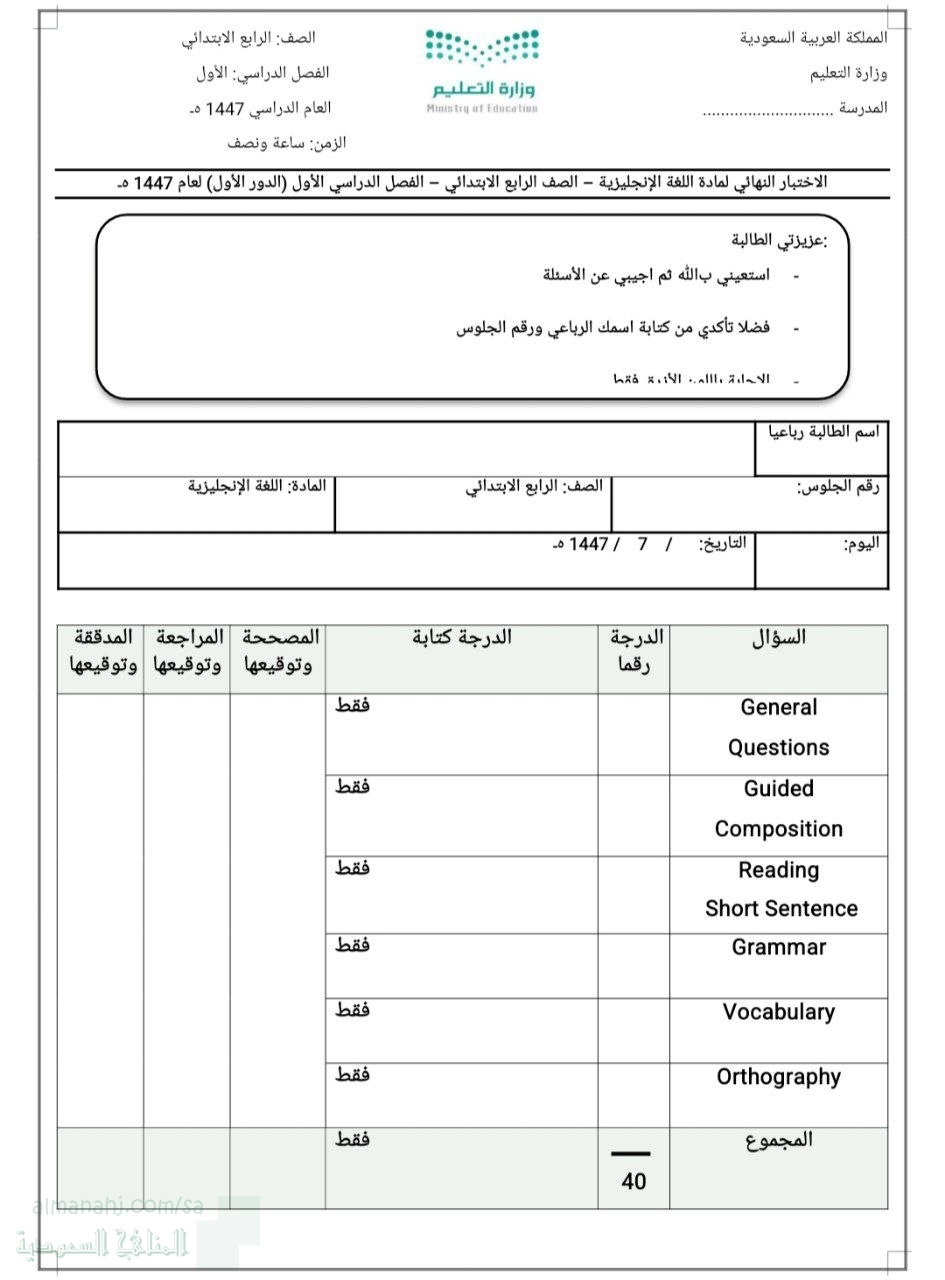 معلومات الملف: يحتوي هذا الملف على نموذج اختبار نهائي شامل للغة الإنجليزية للصف الرابع الابتدائي. | ||