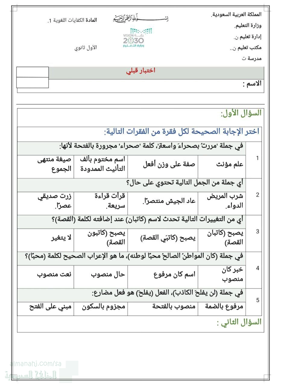 1. الصف الأول الثانوي, لغة عربية, تحليل اختبار قبلي لمادة الكفايات اللغوية 1