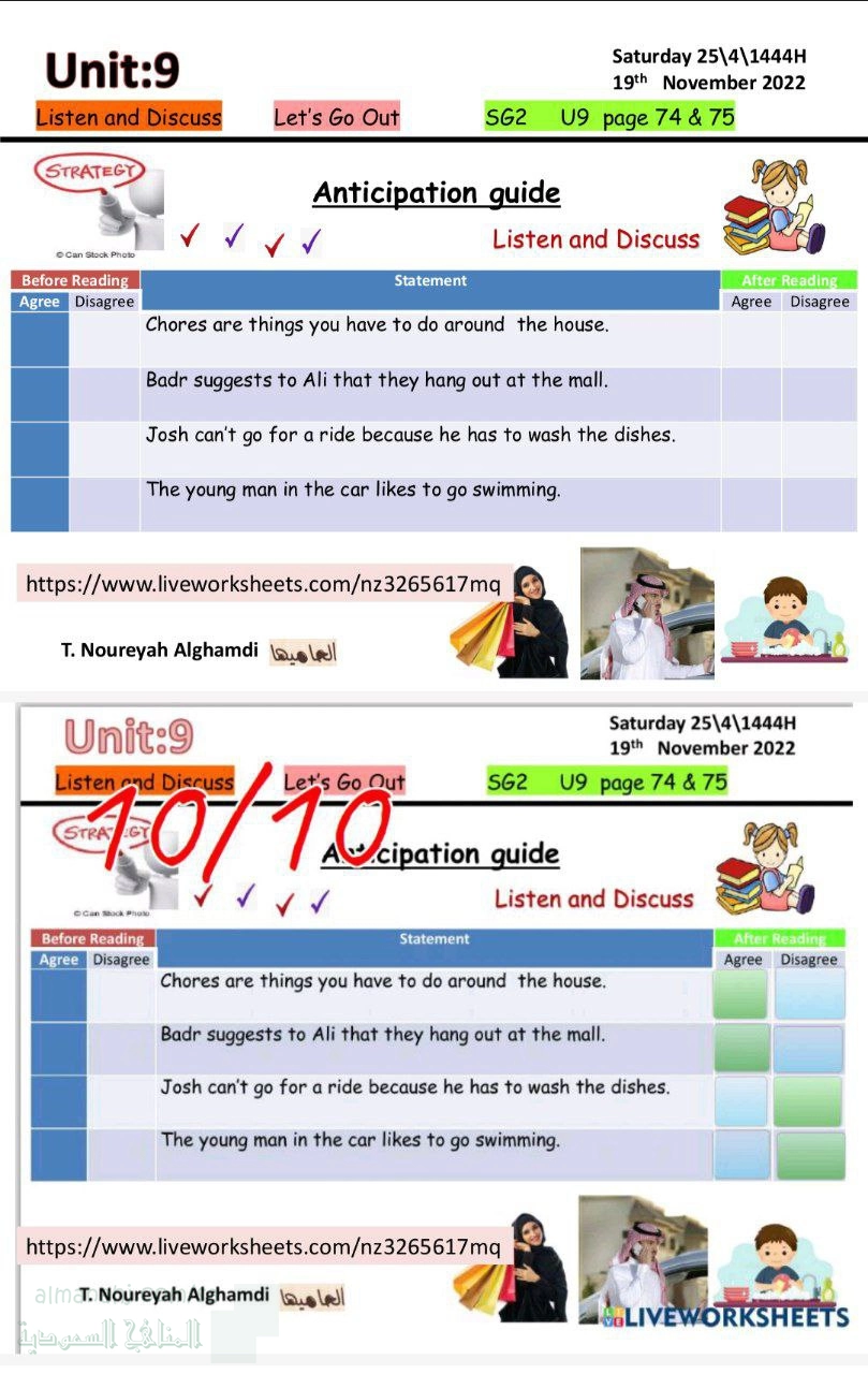معلومات الملف: يقدم هذا الملف نشاطًا استباقيًا (Anticipation Guide) مصممًا لوحدة "Let&039;s Go Out" (دعنا نخرج).