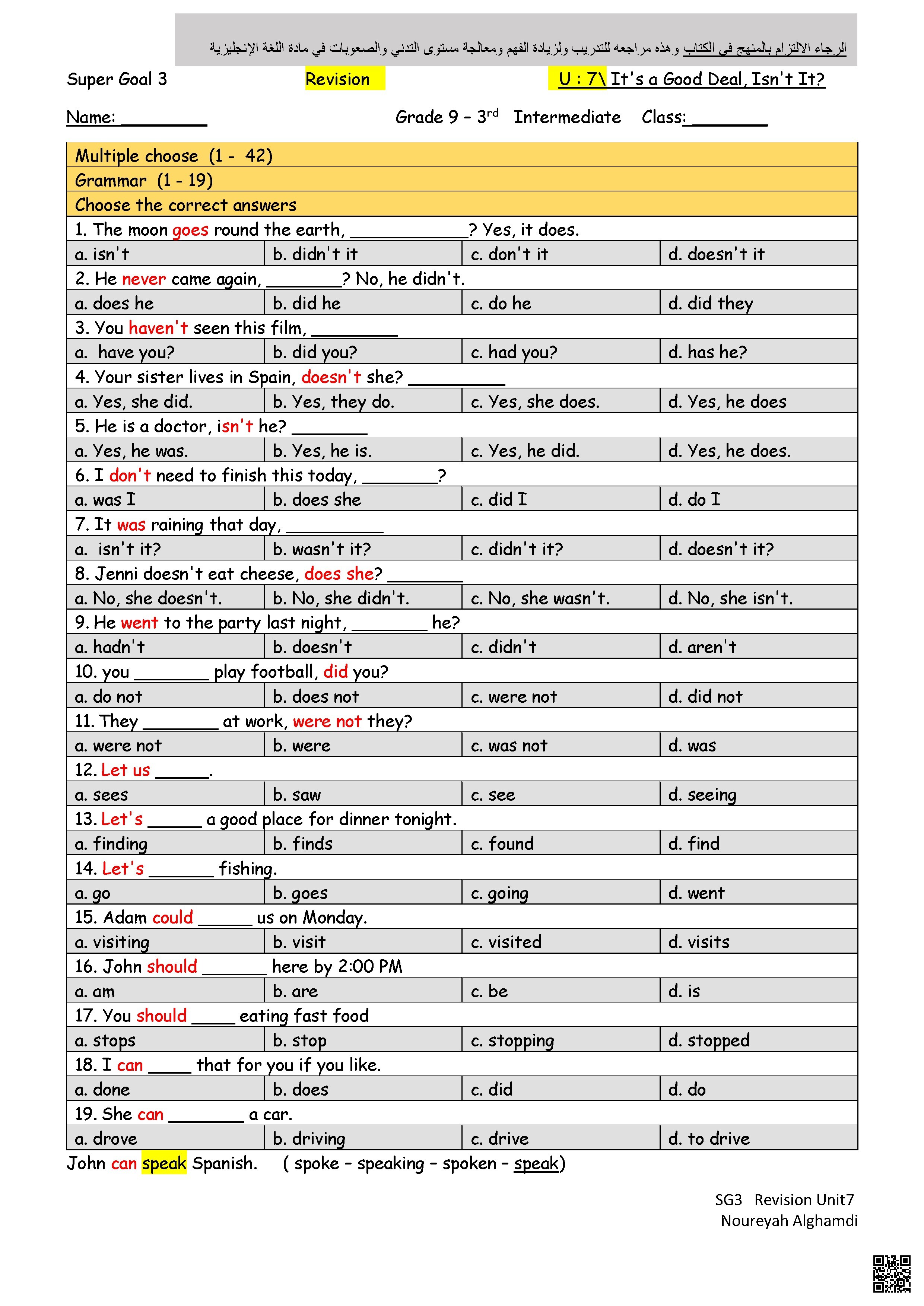 مراجعة وتمارين تقوية لرفع مستوى التدني الوحدة السابعة بحسب الصف الثالث المتوسط في مادة اللغة الإنجليزية – الفصل الثاني