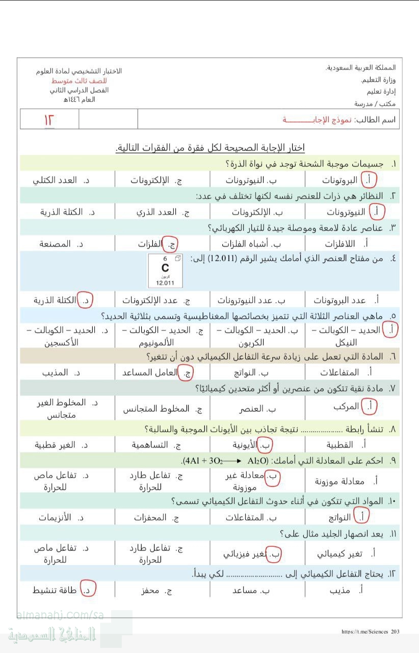 إجابة اختبار تشخيصي1446ه‍, الصف الثالث المتوسط, علوم, الفصل الثاني, 1447_1448 هجري - المناهج السعودية