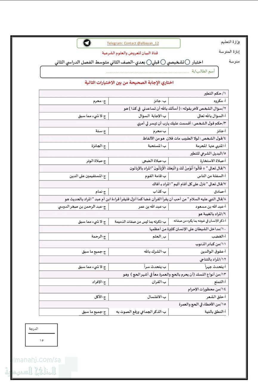 يحتوي الملف على اختبار تشخيصي قبلي وبعدي مخصص لطلاب الصف الثاني متوسط، ويركز على تقييم المعرفة الدينية والأحكام الشرعية.