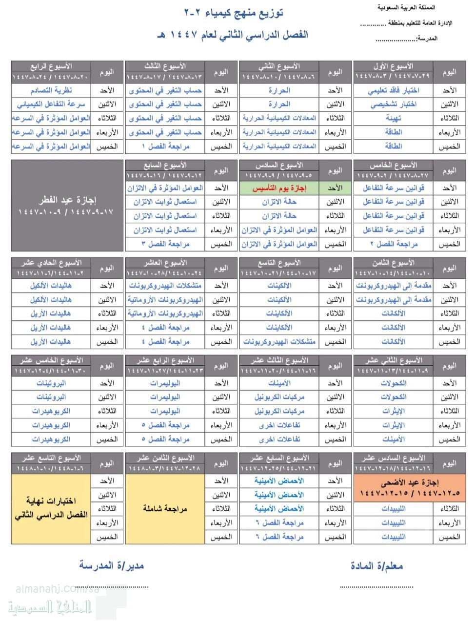 2. كيمياء, الفصل الثاني, 1447_1448 هجري, الخطة الإسبوعية لتوزيع المنهج 1447ه‍