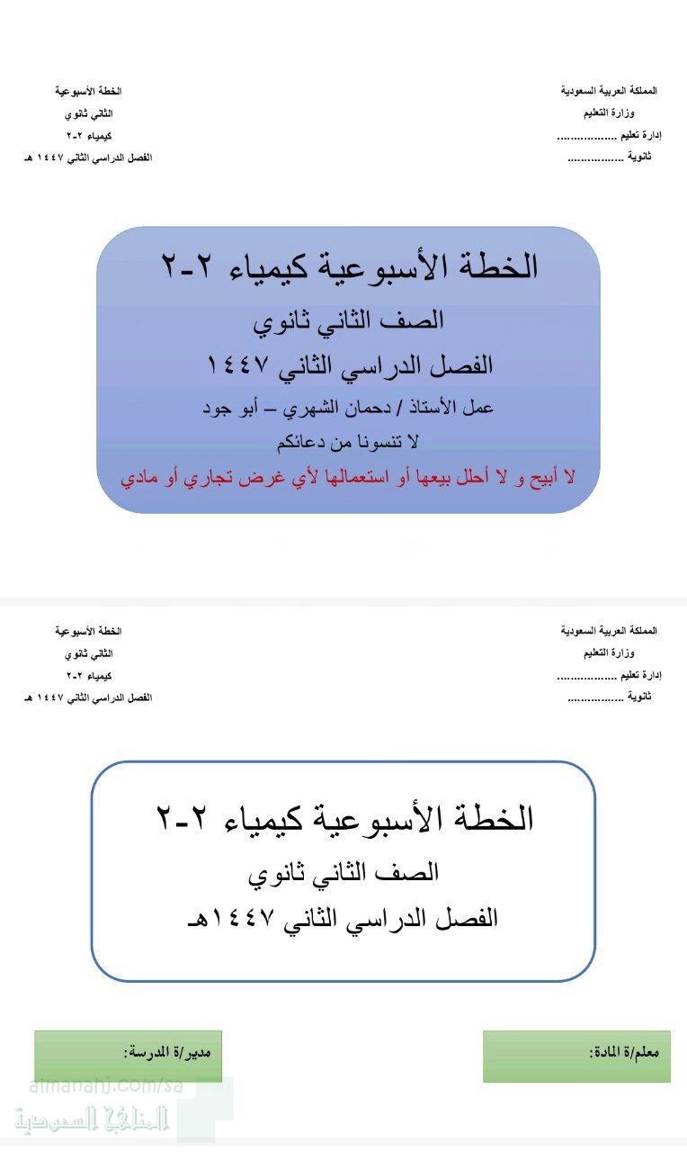 الخطة الإسبوعية لتوزيع المنهج 1447ه‍, دحمان الشهري, الصف الثاني الثانوي, كيمياء, الفصل الثاني, 1447_1448 هجري - المناهج السعودية