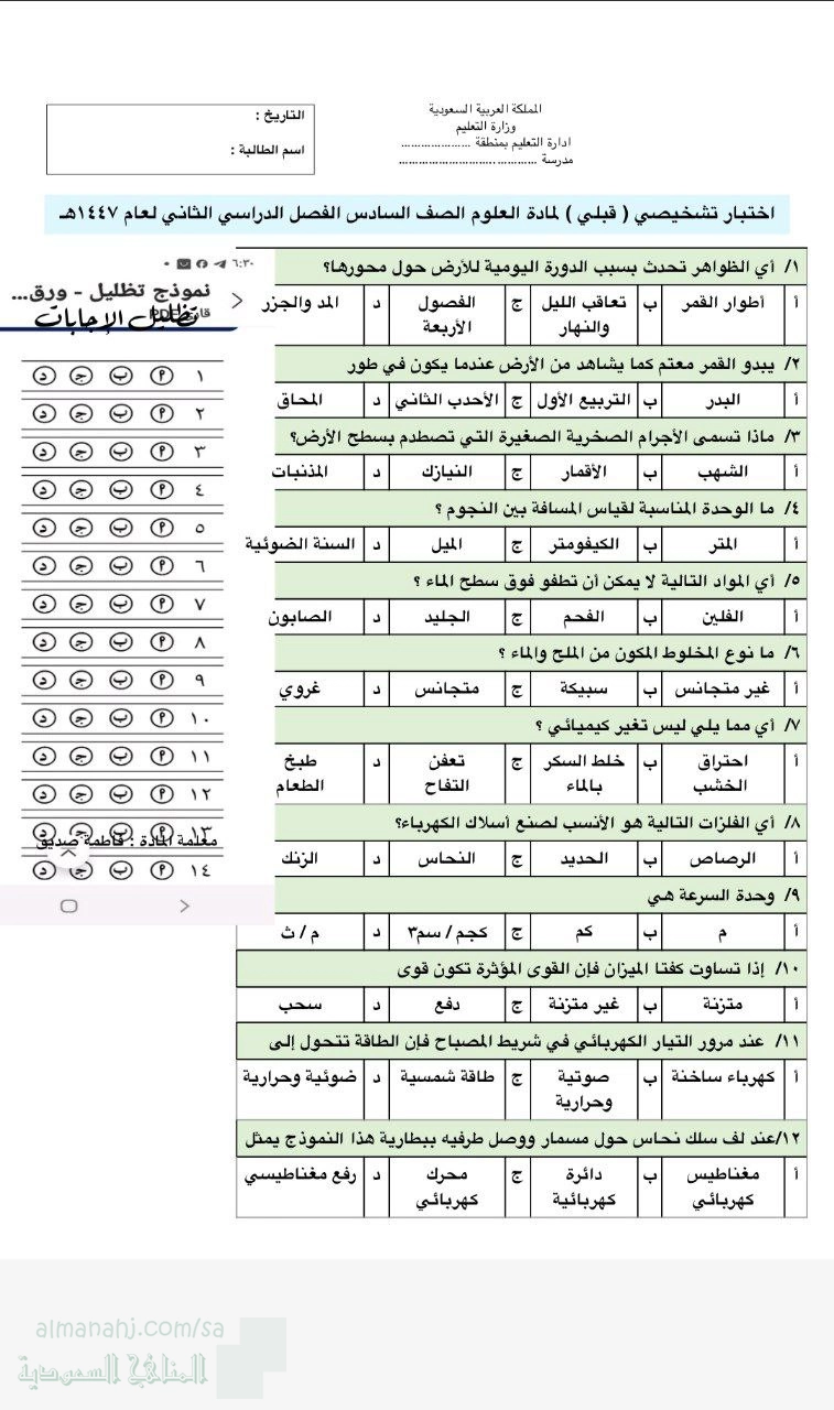 تحليل اختبار تشخيصي محوري, فاطمة صديق, الصف السادس, علوم, الفصل الثاني, 1447_1448 هجري - المناهج السعودية