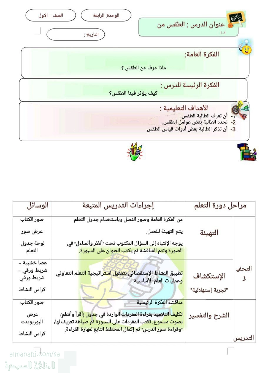 خطة درس تفصيلية لموضوع الطقس باستخدام استراتيجية دورة التعلم وتفريد الأنشطة, الصف الأول, علوم, الفصل الثاني, 1447_1448 هجري - المناهج السعودية