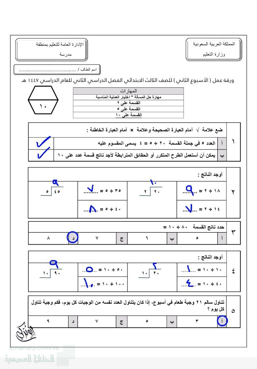 تتضمن ورقة العمل تدريبات على مهارة اختيار العملية المناسبة لحل المسألة، مع تركيز على حقائق وقواعد القسمة على الأعداد ٢ و٥ و١٠.
