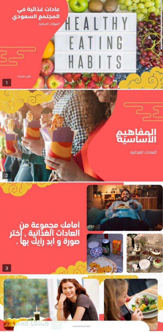 معلومات الملف: يتناول العرض التقديمي موضوع العادات الغذائية في المجتمع السعودي ضمن مادة المهارات الحياتية للصف الأول المتوسط. يناقش العرض مفهوم الوعي الصحي ويهدف إلى تحويل العادات السيئة إلى عادات إيجابية معززة للصحة. كما يقدم استراتيجيات عملية لتغيير العادات السيئة إلى عادات جيدة، مثل استبدال الحلويات المصنعة بالفواكه الطازجة أو المكسرات، وإعداد الوجبات السريعة في المنزل بطرق صحية، وتناول منتجات الألبان قليلة الدسم، واستبدال المنبهات بالمشروبات الطبيعية، وتناول العشاء مبكراً وبكميات خفيفة. | ||