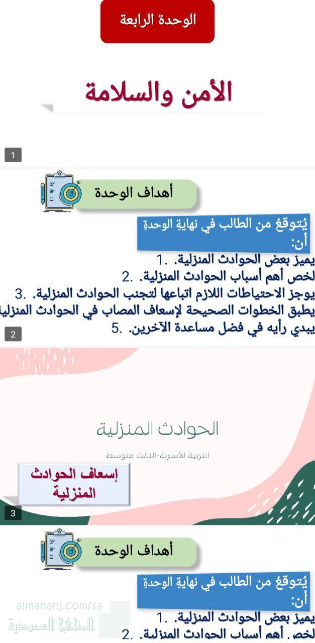 عرض بوربوينت الوحدة الرابعة الأمن والسلامة إسعاف الحوادث المنزلية 2, الصف الثالث المتوسط, تربية أسرية, الفصل الثاني, 1447_1448 هجري - المناهج السعودية