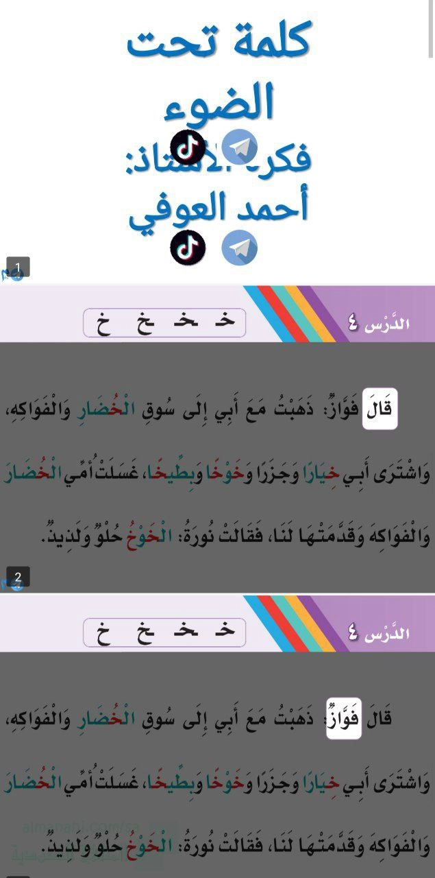 يتبنى الأسلوب نفسه الذي يعتمد على التركيز البصري من خلال تسليط الضوء على الكلمات التي تحتوي الحرف المستهدف، مما يسمح للطلاب بتحديد موقع حرف الخاء وتمييزه بسهولة داخل السياق.