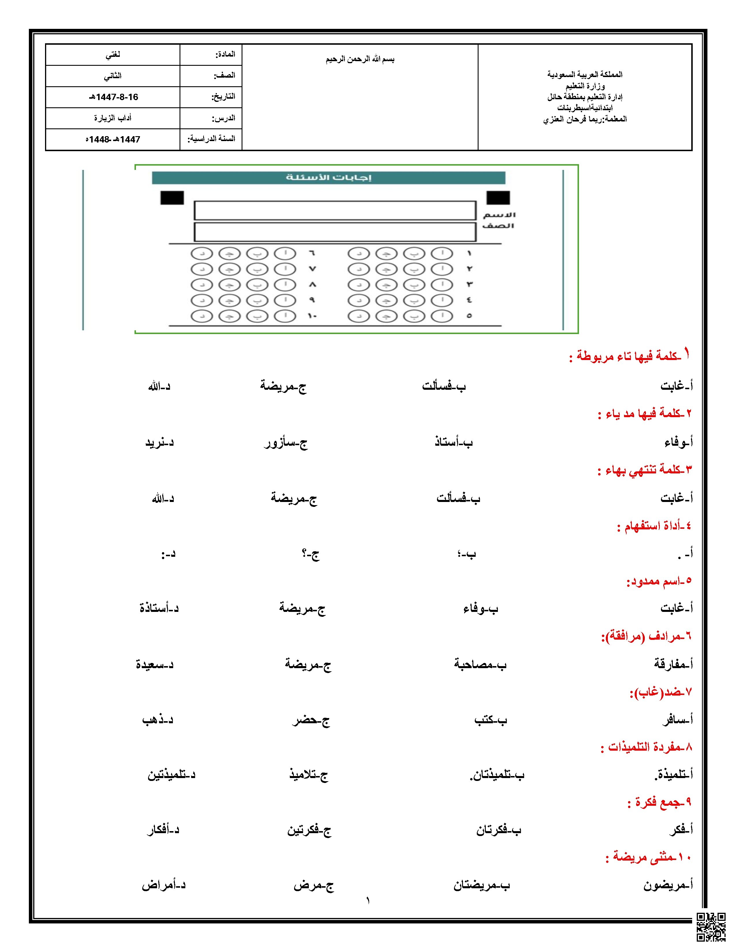 يحتوي الملف على أسئلة اختيار من متعدد (تظليل) حول مفردات لغوية مستنبطة من درس أداب الزيارة، تشمل: كلمات فيها تاء مربوطة، مد ياء، هاء، أداة استفهام، اسم ممدود، مرادف "مرافقة"، ضد "غاب"، مفرد "التلميذات"، جمع "فكرة"، ومثنى "مريضة". الورقة قصيرة ومناسبة للمرحلة الابتدائية.